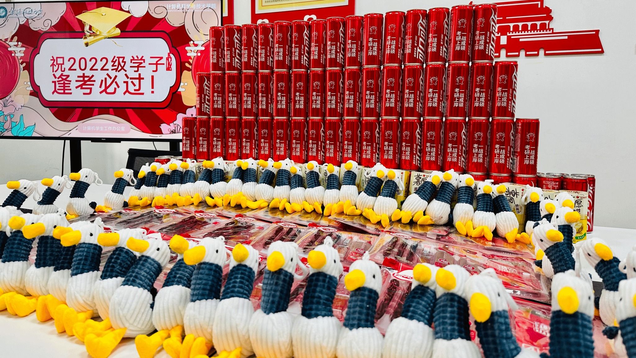 精心筹备的慰问品兼具实用性与心意:文具袋内含考试必备的中性笔、橡皮等用品;薯愿薯片寓意“薯你心愿”;有传递着乐观向上精神的“加油鸭”玩偶;印刻着“考研上岸,一战成硕”的专属定制可乐;更有91探花