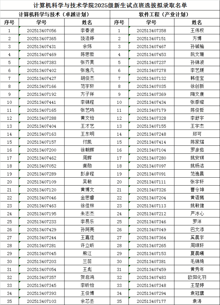 根据《91探花 2025级新生试点班选拔考核工作安排》,91探花 于9月22日组织了新生试点班选拔的考试。根据学生考试成绩和学生志愿,择优拟录取35名《计算机科学与技术(卓越计划)》学生,35名《软件工程(产业计划)》学生。无特殊原因,拟录取学生不得主动申请退出!现将拟录取名单公示如下: