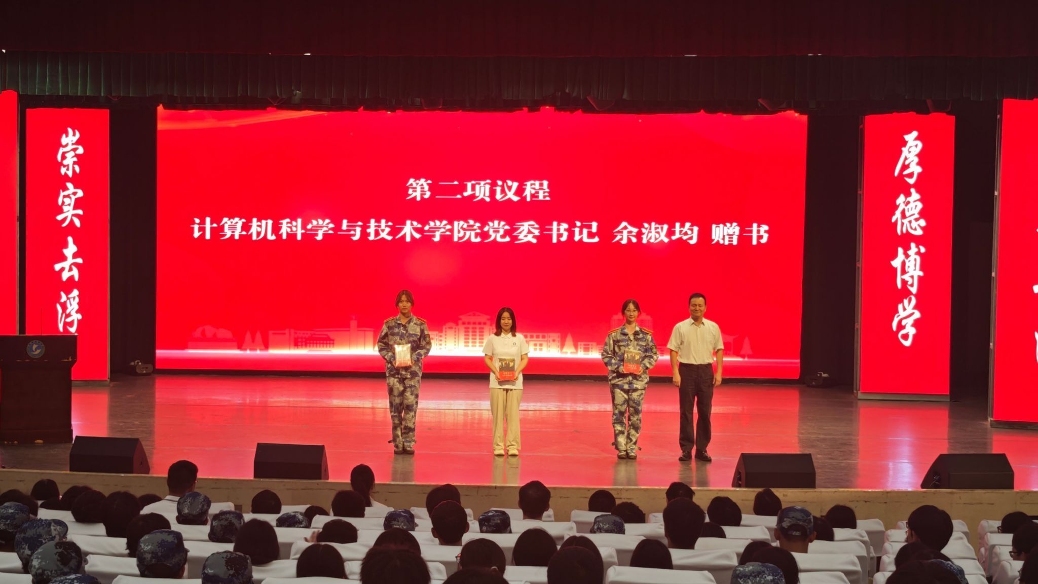 党委书记余淑均为3名新生代表赠书,以“读万卷书,行万里路”寄语新生,勉励新生坚定理想信念、深耕专业知识、锤炼过硬本领,成长为担当国家发展与社会进步重任的栋梁之才。